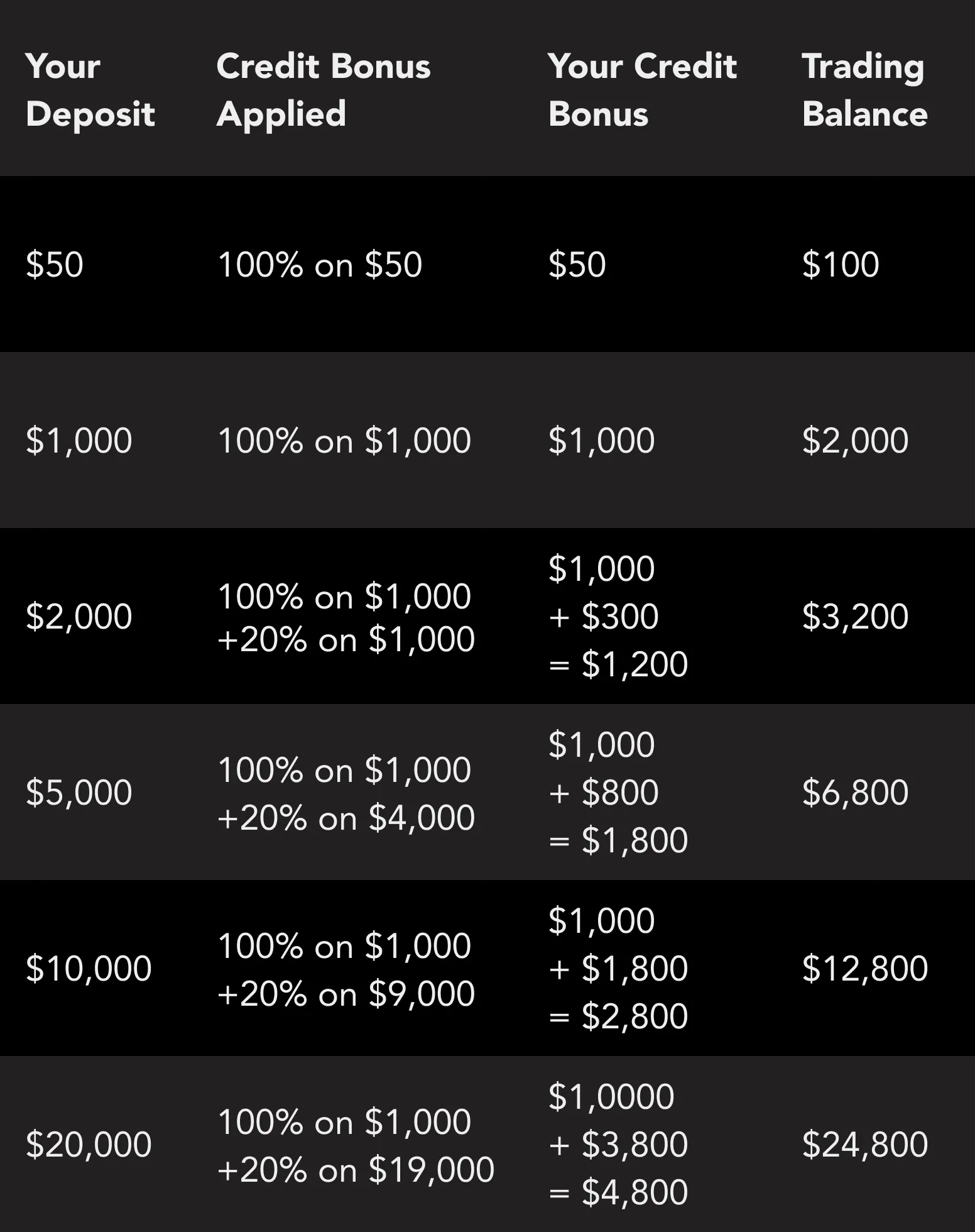 *Any profits generated from closed orders can be withdrawn at any time. However, withdrawing any portion of your original deposit will result in the proportional removal of your credit bonus. Transferring funds between your trading accounts is also considered withdrawal.